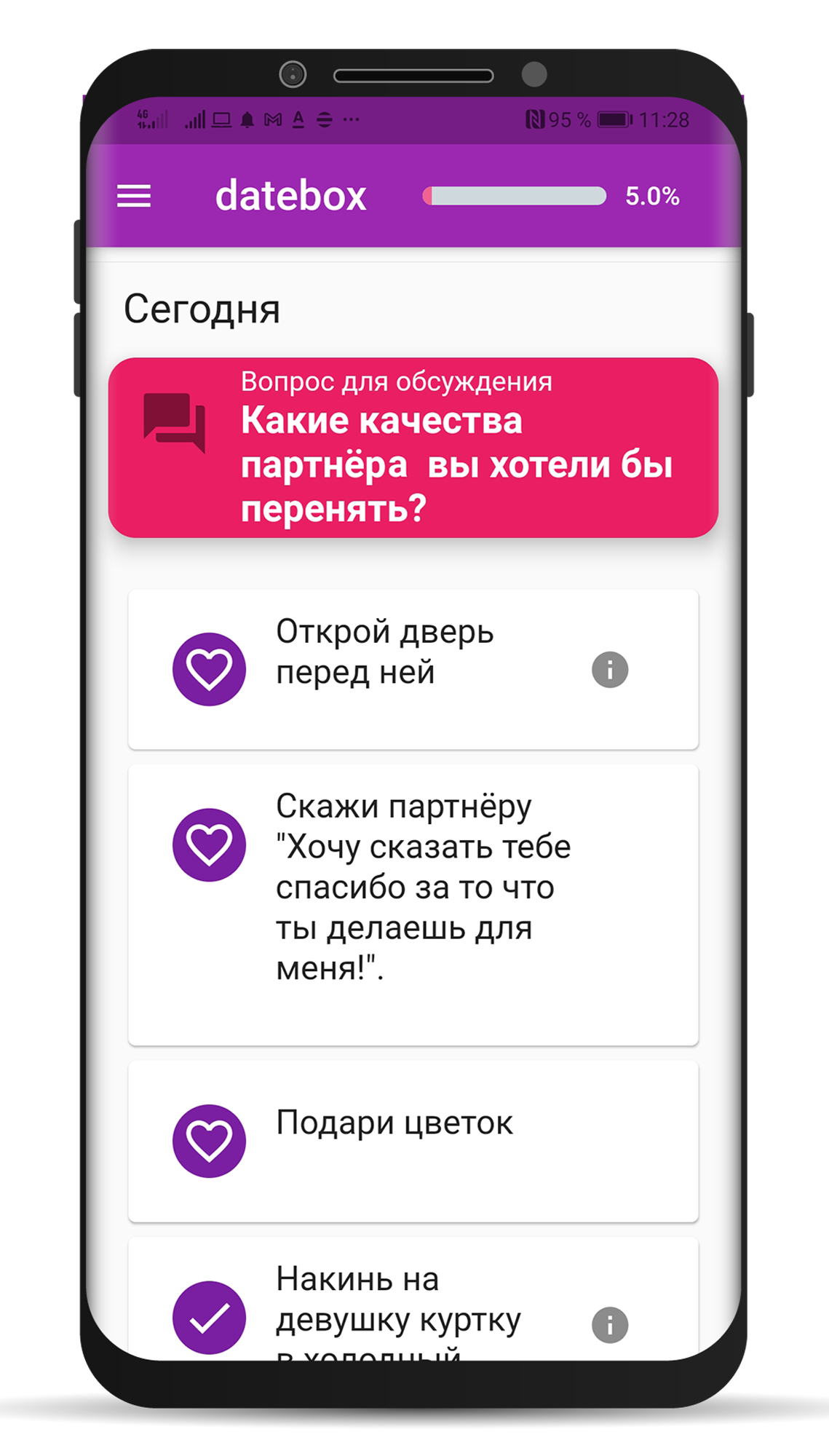 Помимо ежедневного вопроса приложение подберет простые активности выполняя которые вы добавьте романтики в отношения и порадуете партнёра показав как вы его цените.